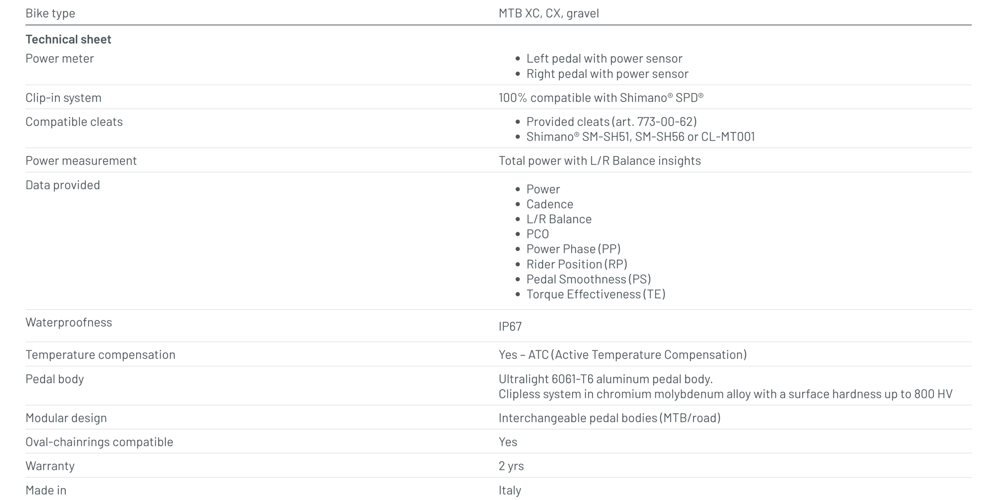 - Modular design – interchangeable pedal bodies (MTB/road)