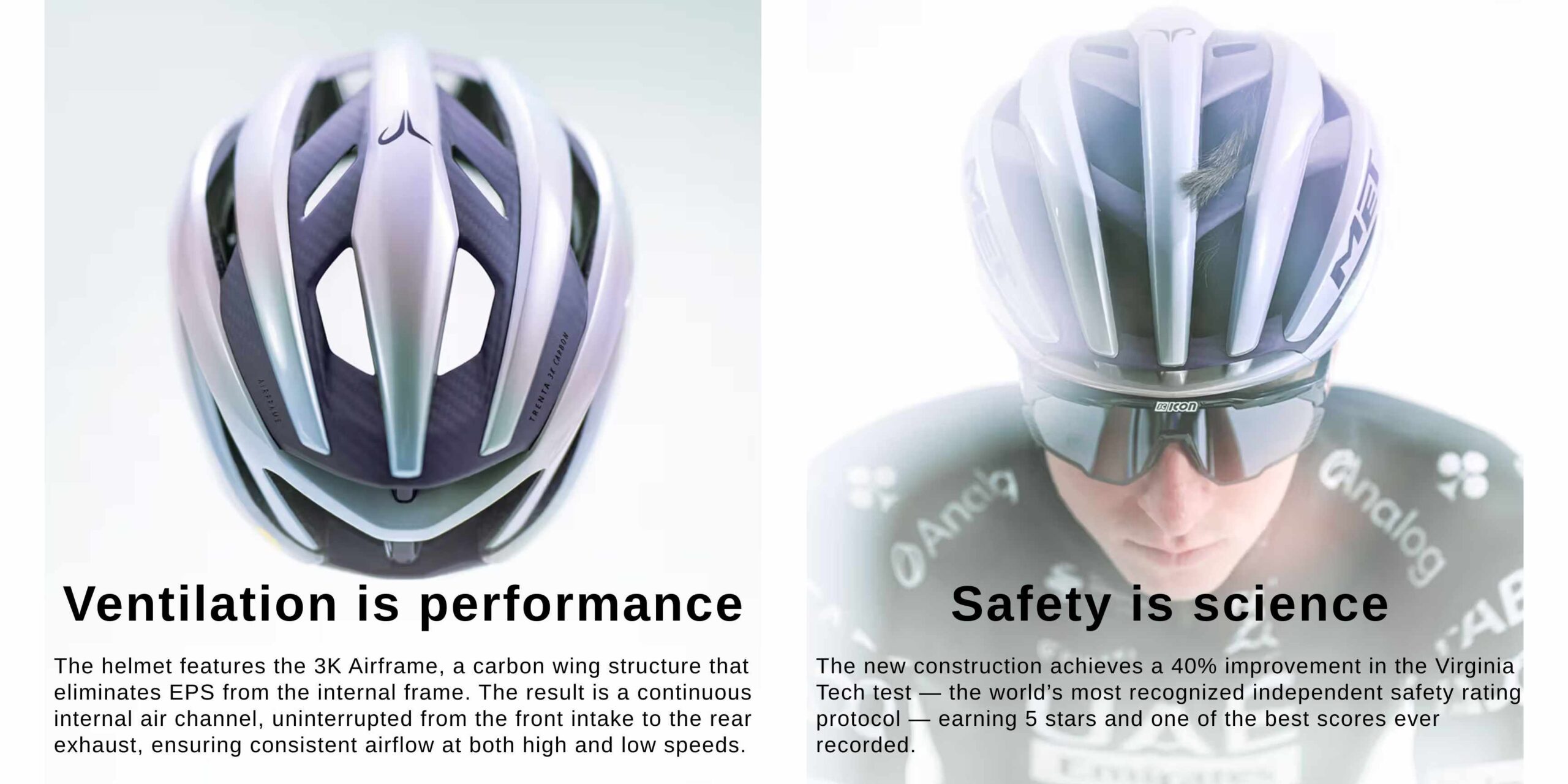 The new MET Trenta 3K Carbon is the most ventilated road helmet ever, developed for the toughest races and refined inside the Tube, our proprietary wind tunnel. The 3K Carbon Airframe reinforces the internal structure while opening wider air channels to maximise cooling during hot rides, long climbs, and sustained, high-intensity efforts.